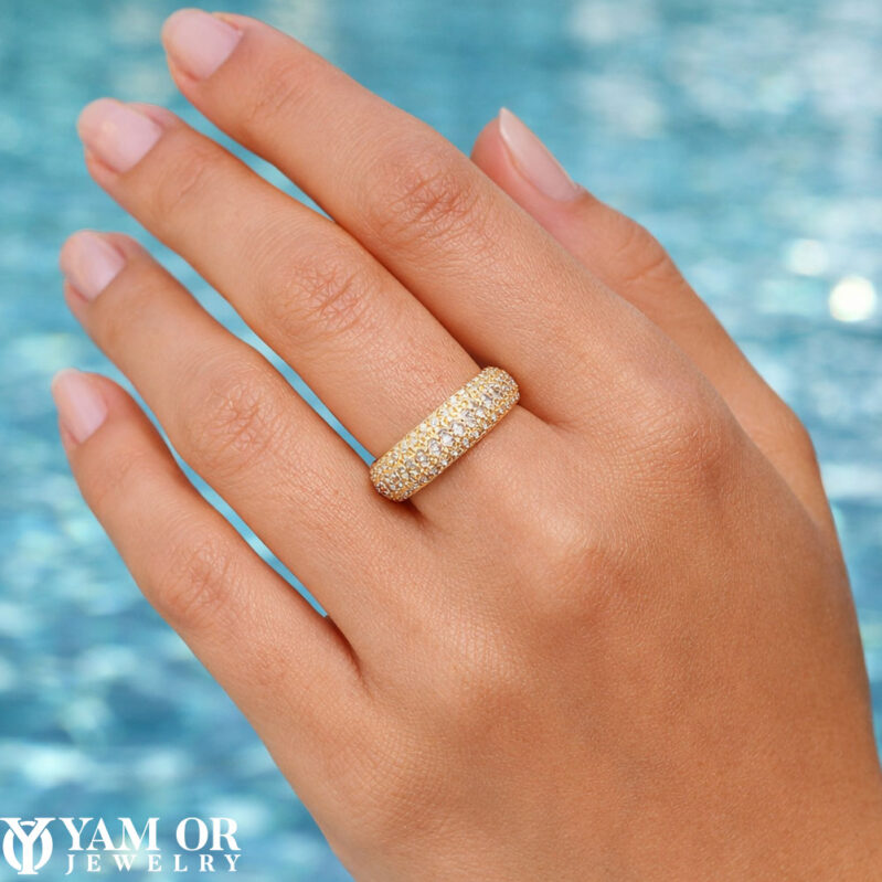 הטבעת משדרת אלגנטיות טהורה – עם זהב צהוב 14K מעובד בצורה מושלמת ורצועת יהלומים טבעיים, מלוטשים ואיכותיים ברמת ניקיון VS1 המבטיחה ברק גבוה, צלילות נקייה ואור שנשבר בצורה מדהימה מכל זווית.