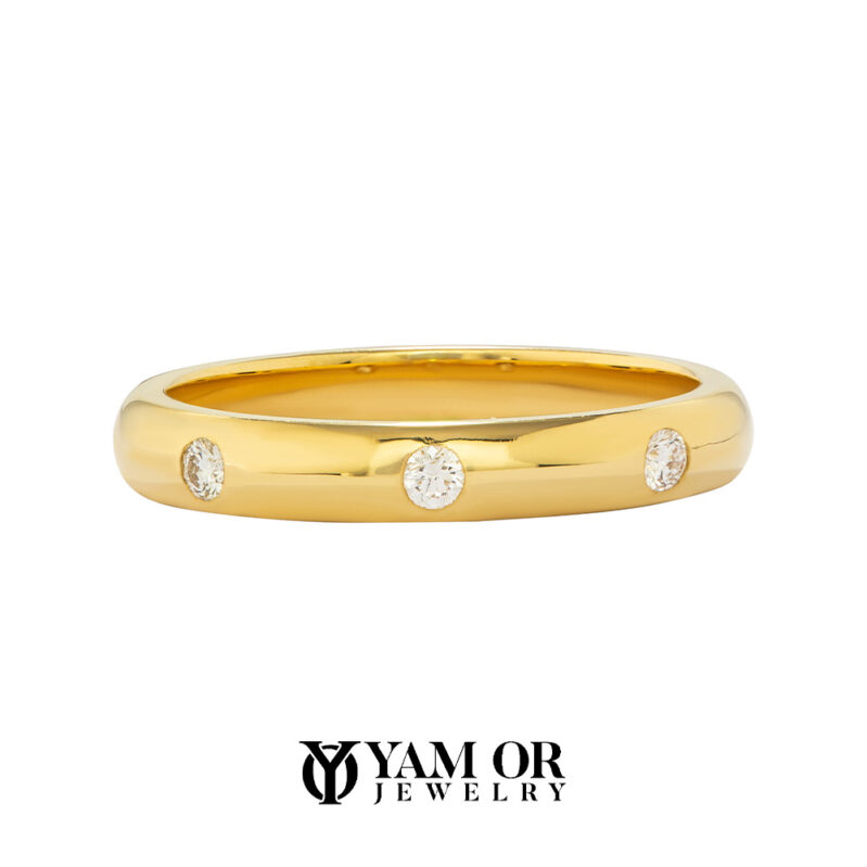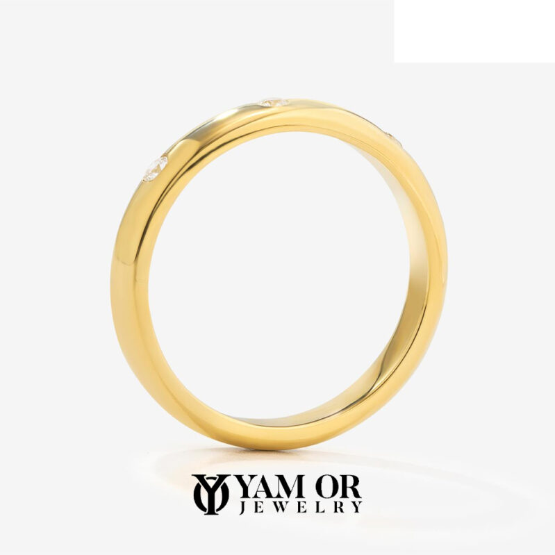 הטבעת משלבת זהב צהוב 14K אמיתי בגימור מבריק ויוקרתי יחד עם 3 יהלומים מעבדה המשובצים בקו מושלם מסביב לטבעת. כל יהלום בגודל כ־2 נקודות (≈0.02ct), בחיתוך מדויק שמחזיר אור בצורה מרהיבה.